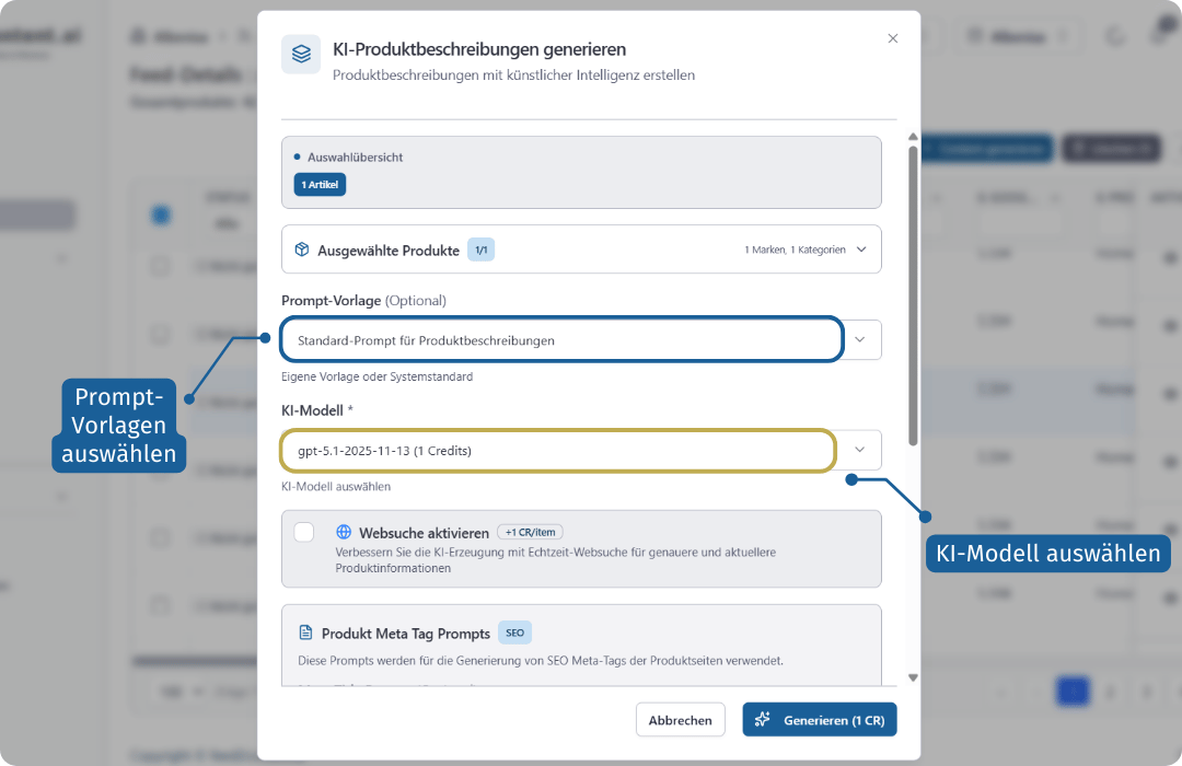 Je strukturierter und detaillierter die Produktdaten im Feed sind, desto informativer und spezifischer werden die generierten Texte.