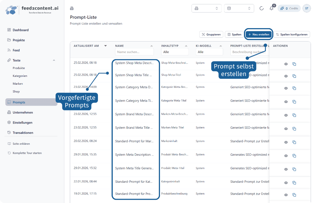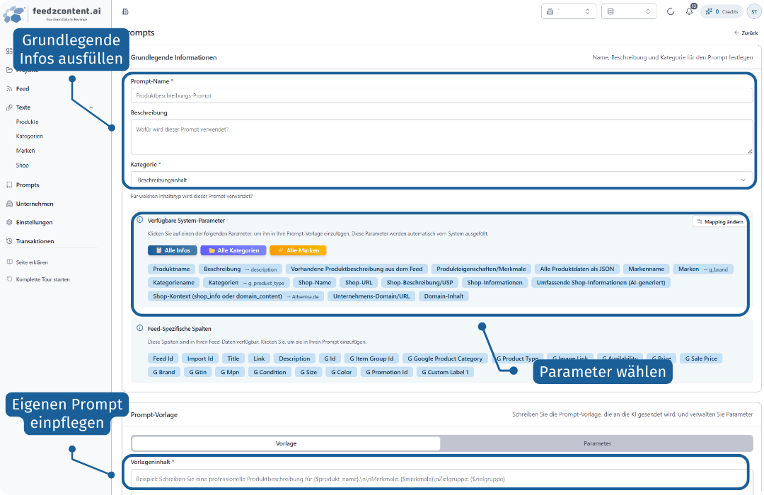 Allerdings besteht auch die Möglichkeit neue Prompts unter https://app.feed2content.ai/prompts zu fertigen, die auf eigenen Regeln basieren.